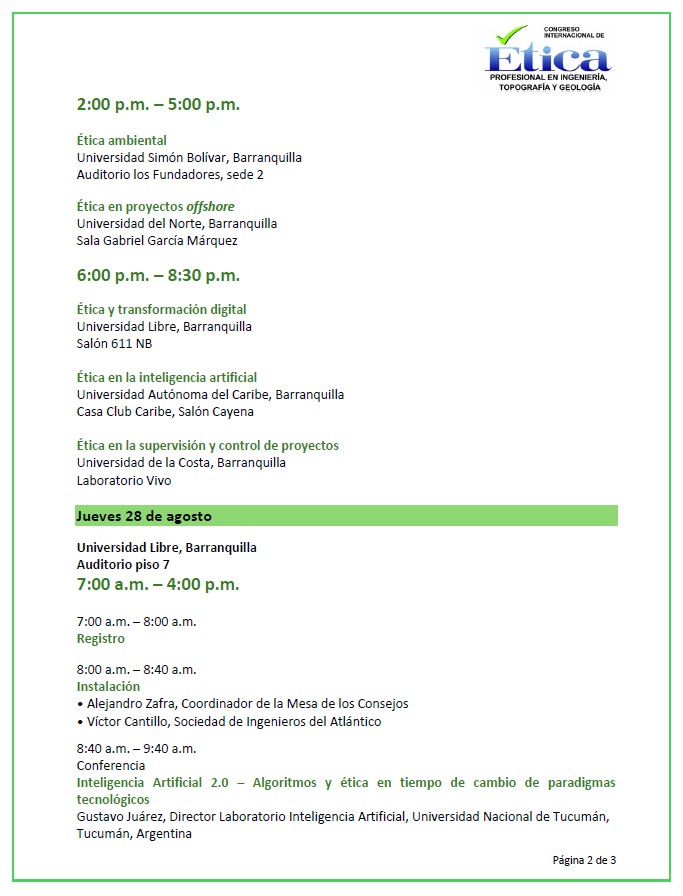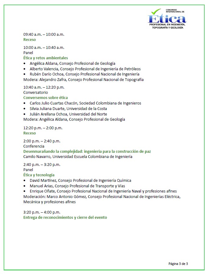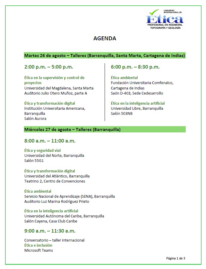 Agenda A continuación, encontrará la agenda general del evento, en la que se muestran horarios, ciudades, sedes y actividades para que programe su experiencia en esta gran iniciativa por la ética profesional.Esta agenda se encuentra sujeta a modificaciones.